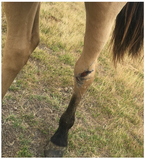 A cutaneous wound on the hindlimb of a horse. In this location, additional impacts on the underlying extensor tendon or tarsal joint may be present. The extent of such additional impacts will determine the severity of pain associated with the wound. Image: A.M. Harvey.