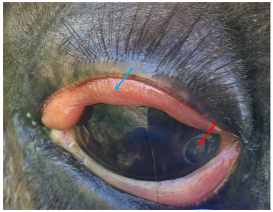 Blepharospasm is an involuntary contraction of eyelid muscles (blinking) in response to ocular pain that may arise with a range of ocular pathologies or injuries. The cornea is the most densely innervated tissue in the body, resulting in it being 300–600 times more sensitive than skin [52]. Thus, a very tiny corneal injury/ulcer can cause intense ocular pain (Figure 6). Corneal injury is the most common cause of blepharospasm in horses [53]. Stimulation of corneal nerves induces blinking, which is resolved with analgesia, thereby providing evidence of a link between corneal pathology and ocular pain.