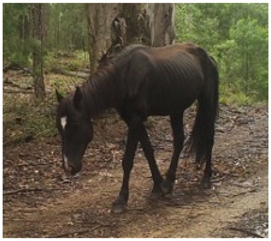 Camera trap image demonstrating head lower than withers posture in a thin wild horse, suggestive of mental experiences of chronic pain/malaise/fatigue/exhaustion. Image: A.M. Harvey.