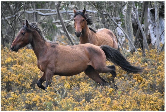 It is recognised that aspects of behaviour that may be altered by pain include elements of demeanour, posture, and gait, as well as interactive behaviours [65]. However, behaviour is also influenced by other factors including temperament, sex, age, and environment [70]. Not showing outwards signs of pain or illness is an important survival strategy for prey species, making behavioural signs of pain or illness difficult to observe and identify in free-roaming wild horses [71]. To the authors’ knowledge, scientific assessment of pain or illness in wild free-roaming horses has not been attempted.