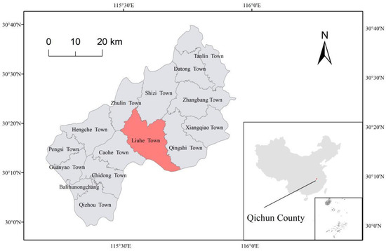 The research was conducted in Qichun County (29°59–30°40′ N, 115°12′–115°56′ E) (Figure 2), located in Hubei Province, China. Qichun County is characterized by a subtropical continental monsoon climate with four seasons, a mild climate, sufficient light, and abundant rainfall. The average annual temperature is 16.8 °C, with summer extremes as high as 39.7 °C ranging from mid-May to mid-September and winter extremes as low as −15.6 °C ranging from mid-December to mid-February. The average annual relative humidity is 80%, with the highest being 82% in February–March and the lowest being 77% in August. The study area is hilly, and the vegetation mainly comprises secondary forests [32].