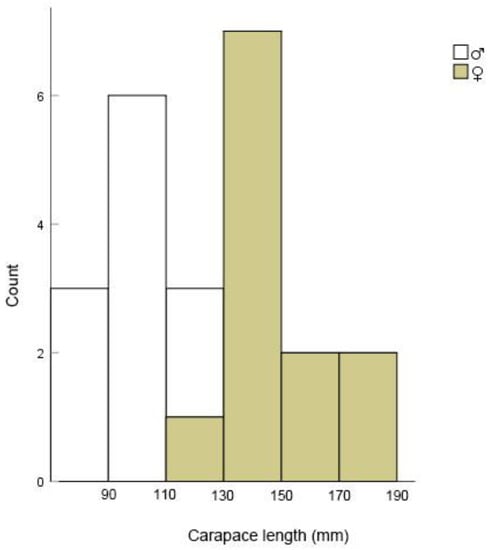Carapace length–class distributions of Reeves’ turtles (Mauremys reevesii) tracked during field surveys in Qichun County, Hubei Province, China.