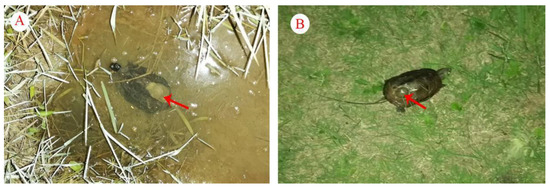 Turtles with transmitters in their natural habitat, where (A) is a male in an aquatic habitat, and (B) is a female in a terrestrial habitat. The red arrow indicates the transmitter.
