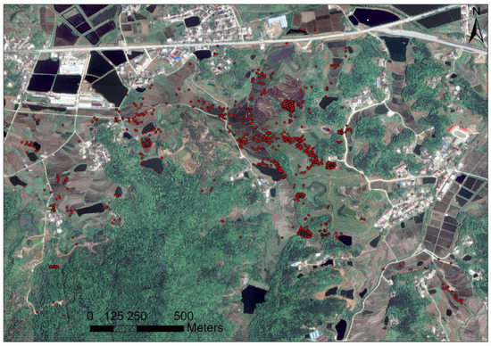 The locations within the active area of the Reeves’ turtles in Qichun County, Hubei Province. The red points indicate their locations.