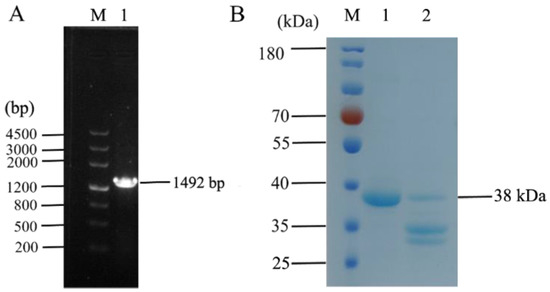 The recombinant expression vector pET-32a::IFN_OaBac5mini was designed as shown in Figure S1. In brief, IFN_OaBac5mini fragments containing an enterokinase site were amplified by three-step polymerase chain reaction (PCR) with PrimeSTAR Max Premix (TaKaRa, Kyoto, Japan). For the first step of PCR, pET28a-SUMO::IFN + PG plasmid was used as the template, and OaBacR1 containing restriction endonuclease sites was used as the primer (Forward: 5′-CCAGAGGTCAAGCCAGAAGT-3′ and Reverse: 5′-CGGCGGACGACGAATCGGCGGACGAAACCTCTTGTCGTCGTCGTCGCCT-3′). The PCR products were purified using E.Z.N.A® Gel Extraction Kit (Omega, Norcross, GA, USA) and used as the template for the second step of PCR with the following primers: OaBacR2 (Forward: 5′-CCAGAGGTCAAGCCAGAAGT-3′ and Reverse: 5′-CGAAACGGAGGACGAAAAGGCGGACGAATCGGCGGACGACGAATCGGCGG-3′). The final PCR step was performed using the gel-purified PCR products from the second step of PCR with the following primers: OaBacR3 (Forward: 5′-CCAGAGGTCAAGCCAGAAGT-3′ and Reverse: 5′-TTCTCGAGTTAGCGCACCGGCGGGCGAAACGGAGGACGAAAAG-3′). The final-step PCR fragments were purified and digested with BamHI (Thermo Fisher Scientific, Waltham, MA, USA) and XhoI (Thermo Fisher Scientific, USA). The plasmid pET-32a (+) was digested with the same restriction endonucleases and purified. Then, the linear vector (5860 bp) and IFN_OaBac5mini fragment (612 bp) were ligated with T4 ligase (Thermo Fisher Scientific, USA) overnight at 4 °C, repurified, and transferred into E. coli DH5α by electroporation (GenePulser Xcell PA-400, Bio-Rad, Hercules, CA, USA; time constant protocol: 1800 V voltage, 3 ms TC, 1mm cuvette). The transformants were selected on Luria–Bertani agar (Solarbio, Beijing, China) plates containing 60 μg/mL ampicillin (China National Institute for Drug and Biological Products Control, Beijing, China) at 37 °C. The inserted sequence was amplified from the ampicillin-resistant strains using primers (Forward: 5′-ACTGGATGAAATCGCTGACG-3′, Reverse: 5′-CCGAGATAGGGTTGAGTGTTGT-3′, 1492 bp) and sequenced by Sangon Biotech Co. (Shanghai, China).