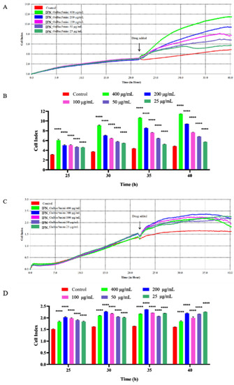Cytotoxicity of digested IFN_OaBac5mini to IPEC−J2 cells and RAW 264.7 cells. Cell indexes of IPEC−J2 cells (A) and RAW 264.7 cells (C) treated with different concentrations of IFN_OaBac5mini are shown. Recombinant IFN_OaBac5mini significantly promoted the proliferation of IPCE−J2 cells (B) (p < 0.0001) and RAW 264.7 cells (D) (p < 0.0001) without obvious cytotoxicity. **** p < 0.0001 vs. control group. n = 4.