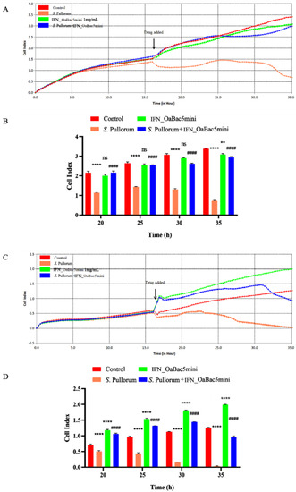 Cell viability of IPEC−J2 and RAW 264.7 cells treated with S. Pullorum and/or recombinant OaBac5mini. Cell indexes of IPEC−J2 cells (A) and RAW 264.7 cells (C) are shown. S. Pullorum significantly decreased the cell indexes of IPEC−J2 cells (B) (p < 0.0001) and RAW 264.7 cells (D) (p < 0.0001), and recombinant IFN_OaBac5mini significantly increased the cell indexes of IPEC−J2 cells (B) (p < 0.0001) and RAW 264.7 cells (D) (p < 0.0001). ns: p > 0.05 vs. control group, ** p < 0.01 vs. control group, **** p < 0.0001 vs. control group, #### p < 0.0001 vs. S. Pullorum group. n = 4.