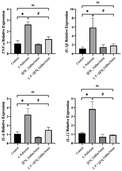 mRNA expression levels of pro-inflammatory cytokines. Relative expression levels of TNF-α, IL-1β, IL-6, and IL-12 in RAW 264.7 cells were significantly upregulated by S. Pullorum (p < 0.05). mRNA expression levels of the pro-inflammatory cytokines in the S. P + IFN_OaBac5mini group were significantly downregulated compared with those in the S. Pullorum group (p < 0.05). Data represent results from triplicate experiments. ns: p > 0.05 vs. control group, * p < 0.05 vs. control group, # p < 0.05 vs. S. Pullorum group.