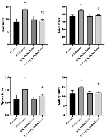 Organ indexes. Organ indexes of the heart, liver, spleen, and kidney of the S. Pullorum infection group were significantly increased compared with those of the control group (p < 0.05 and p < 0.01). Recombinant IFN_OaBac5mini significantly attenuated the increase in organ indexes (p < 0.05 and p < 0.01). * p < 0.05 and ** p < 0.01 vs. control group; # p < 0.05 and ## p < 0.01 vs. S. Pullorum infection group. n = 15.