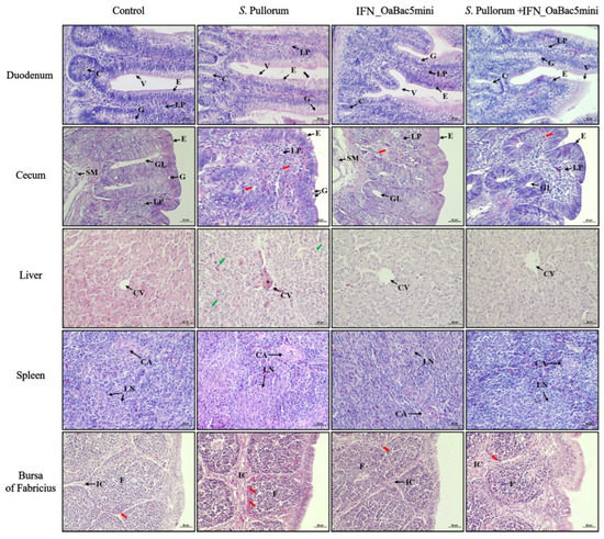 HE staining of the duodenum, cecum, liver, spleen, and bursa of Fabricius slices. Duodenum: black arrow, damaged epithelium; V, villi; C, crypts; E, epithelium; LP, lamina propria; G, goblet cell. Cecum: red arrow, pseudoacidophilic granulocyte; E, epithelium; LP, lamina propria; SM, sub-mucosa; GL, gland; G, goblet cell. Liver: green arrow, macrophages; *, congested central vein; CV, central veins. Spleen: CA, central arteriole; LN, lymphoid nodule. Bursa of Fabricius: red arrow, pseudoacidophilic granulocyte; F, bursal follicule; IC, interfollicular connective tissue.