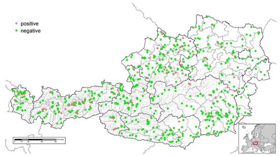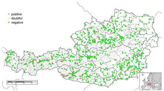 Location of goat herds investigated for the presence of Mycobacterium avium subsp. paratuberculosis specific antibodies in Austria and test results (positive, n = 71; negative, n = 567).