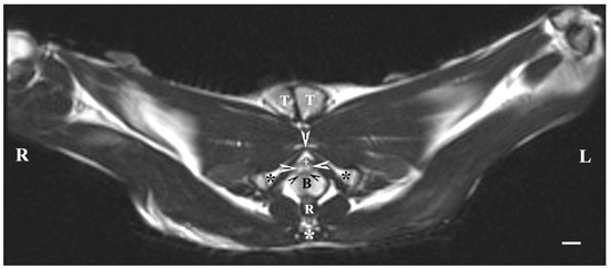 T1-weighted transverse image of rabbit pelvis through the level of the second caudal vertebra (white star): R—right; L—left. Bulbourethral glands (white horizontal arrows), the pelvic part of the urethra (white cross), penile bulb (B), rectum (R), ischial bones (black stars), the caudal part of the pelvic symphysis (white perpendicular arrow), pelvic diaphragm (black perpendicular arrow), and testes (T). Line—10 mm.