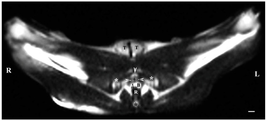 T1-weighted transverse image of rabbit pelvis at the level of the first caudal vertebra (black star): R—right; L—left. Bulbourethral glands (white horizontal arrows), the pelvic part of the urethra (black cross), penile bulb and penile root (B), rectum (R), ischial bones (white stars), the caudal part of the pelvic symphysis (white perpendicular arrow), pelvic diaphragm (black perpendicular arrow), and testes (T). Line—10 mm.