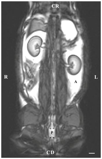 MRI was performed using a tunnel MR scanner (1.5 T, Magnetom Essenza, version of software—Tim+Dot, Siemens Healthcare, USA, Whole body imaging; Dot®, The Siemens MRI software, Ferndale, MI 48220). The animals were positioned horizontally in the supine position on a flat table, as the pelvis was positioned in the isocenter of the magnet. Immediately before the study, a spasmolytic medication (Ketonal, Lek Pharmaceuticals d.d., Verovškova 57, Ljubljana, Slovenia, 100 mg/2 mL solution for injection, 1 mg/kg i.m.) was applied to eliminate intestinal peristalsis, which could worsen image quality [24,25]. The retroperitoneal pelvic space and the bulbourethral glands were studied in transverse, dorsal and sagittal planes at a distance from the seventh lumbar vertebra (L7) to the third caudal vertebra (Cd 3). The section thickness was 2 mm [12].