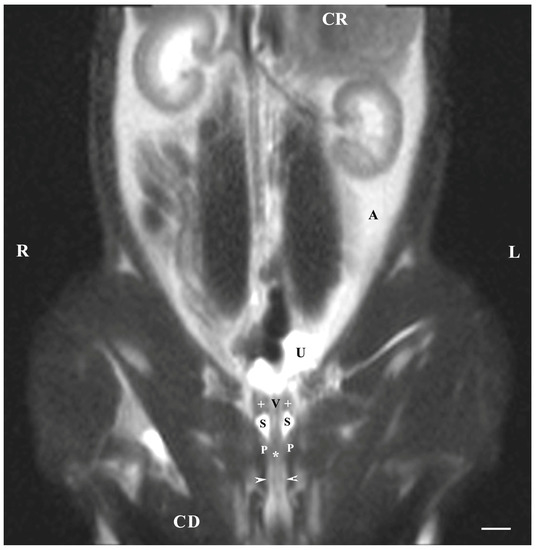 T2-weighted dorsal image of rabbit pelvis (at the level, close to the pelvic symphysis): R—right; L—left; CR-cranial; CD—caudal. Bulbourethral glands (horizontal white arrows), prostate complex (P), vesicular glands (white cross), pelvic symphysis (S), neck of the urinary bladder (V), the pelvic part of the urethra (white star), urinary bladder (U), adipose tissue (A). Line—10 mm.