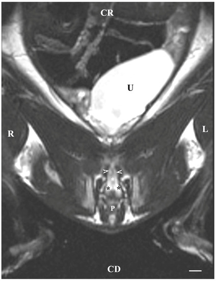 T2-weighted dorsal image of rabbit pelvis (at a greater distance, at the level to the pelvic symphysis): R—right; L—left; CR—cranial; CD—caudal. Bulbourethral glands (black stars), caudal part of the prostate gland complex (white horizontal arrows), the pelvic part of the urethra (white star), urinary bladder (U), and penis (P). Line—10 mm.