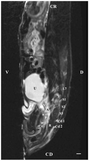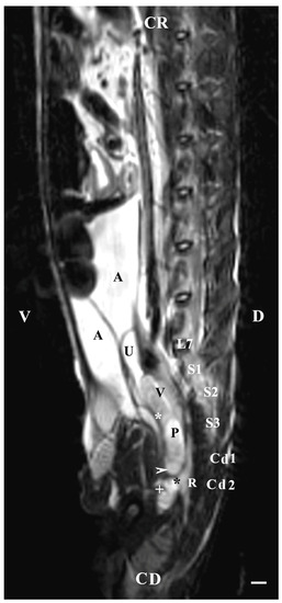 T2-weighted sagittal image of rabbit pelvis: V—ventral; D—dorsal; CR—cranial; CD—caudal. Bulbourethral glands (horizontal white arrow), vesicular glands (V), prostate gland complex (P), the pelvic part of the urethra (white star), the caudal part of the urinary bladder (U), adipose tissue (A), rectum (R), pelvic diaphragm (black star), root of the penis (white cross), L7—seventh lumbar vertebra, S1—first sacral vertebra, S2—second sacral vertebra, S3—third sacral vertebra, Cd1—first caudal vertebra, and Cd2 second caudal vertebra. Line—10 mm.