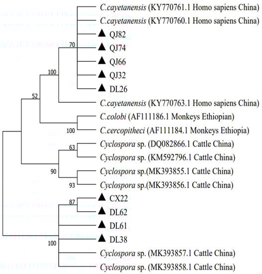 Phylogenetic relationship of Cyclospora spp. of Holstein cattle in the Yunnan Province. The genotypes identified in this study are marked with ▲.