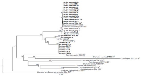 Phylogenetic analyses suggested that a cluster of seven Sarcina strains (D3/3C, K3/7B, S8/2c, S10/2a, S1/3c, K1/7A, and S2/2b) and Sarcina sp. N13/4e represents a novel Sarcina taxonomic unit. However, sophisticated modern methods, especially those based on whole-genome sequences, must be used to confirm this assumption.