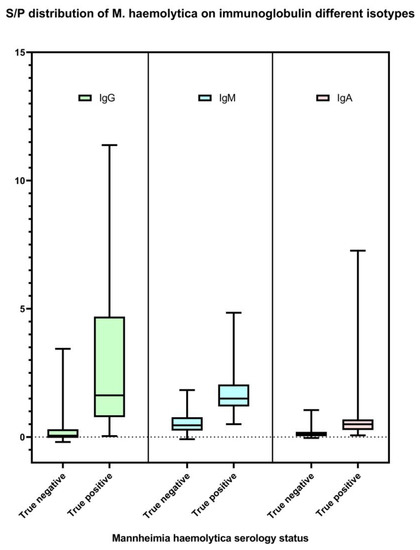 Distribution of M. haemolytica IgG, IgM, and IgA isotype-specific ELISA sample-to-positive (S/P; Y-axis) based on test validation samples (n = 145). Serum samples collected from the cattle that were negative for M. haemolytica culture on study day 0 (n = 100) were classified as true M. haemolytica antibody-negative. Serum samples collected from the cattle at least 14 days after M. haemolytica isolation positive (n = 45) were classified as true M. haemolytica antibody positive.