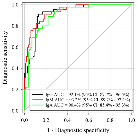 Receiver operating characteristic (ROC) curve analysis of the M. haemolytica IgG, IgM, and IgA isotype-specific ELISA sample-to-positive (S/P) based on testing serum samples from M. haemolytica-culture-free (true negative) (n = 100) and M. haemolytica-positive (true-positive) cattle (n = 45).