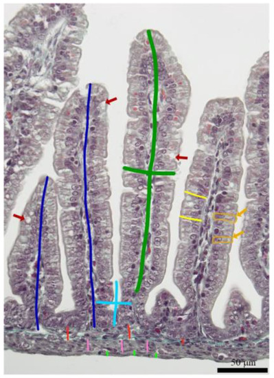 Representative image of duodenal wall showing measurement scheme of morphological parameters: the length and thickness of intestinal villus (green line), the depth and thickness of the crypt (light blue line), thickness of the villus epithelium (light yellow line), mucosa (dark blue line), submucosa (red line), and longitudinal (light green) and circular (pink line) muscle layers. Orange arrows show enterocytes (additionally outlined by orange line), while red arrows show goblet cells.