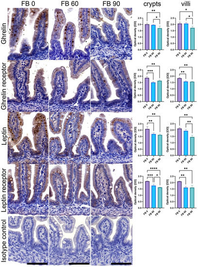 The immunohistochemical (IHC) stain was performed with rabbit anti-leptin, anti-leptin receptor, anti-ghrelin, and anti-ghrelin receptor as primary antibodies (#DF8583, #DF7139, #DF6389, #DF2794, respectively, all Affinity Biosciences, Jiangsu, China), diluted (1:300) in Diamond antibody diluent (Cell Marque Corp., Rocklin, CA, USA). The sections were then processed with a ready-to-use, two-step detection system of poly-HRP-anti-mouse/rabbit IgG (#IM-DPVB110HRP, BrightVision, Immunologic WellMed B.V., Duiven, Netherlands), developed in DAB (#D5905, Sigma-Aldrich, St. Louis, MO, USA) and counterstained with Mayer’s hematoxylin (Patho, Mar-Four, Konstantynów Łódzki, Poland) [34]. The IHC images, acquired using a bright-field microscope (BX-61, Olympus, Tokyo, Japan) and the 20× objective (200× total magnification), were analyzed using an ImageJ-compatible plugin for analyzing cytoplasmic staining patterns by assigning a histogram profiling and scoring the deconvoluted DAB images using IHC Profiler [35], an open-source plugin for semiquantitative and quantitative evaluation and automated scoring of immunohistochemistry images. An optical density (OD) quantitative score was calculated according to algebraic formula previously described by Jafari and Hunger [36].The measurements were carried out separately for villi and crypts in five randomly selected areas of the positive signal by an associate who was blinded to the treatment.