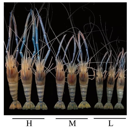 Among the most important crustacean species in aquaculture throughout tropical and subtropical regions, the giant freshwater prawn (GFP; Macrobrachium rosenbergii) is one of the world’s most important economic freshwater crustaceans; it has rapid growth rates, a wide diet, a short breeding cycle, rich meat nutrition, and good adaptability []. Furthermore, it is the largest freshwater prawn in the world []. The cultivation of M. rosenbergii has been increasingly important in enhancing agricultural efficiency and farmer incomes in China. In 2021, the production of M. rosenbergii reached 171,000 tons, and it is widely farmed in parts of southern China such as Jiangsu, Zhejiang, Guangdong, etc. However, with the growing demand for M. rosenbergii, the supply of genetically improved varieties is causing a bottleneck in M. rosenbergii aquaculture. Hence, the breeding of new varieties with improved traits, including stress tolerance, high growth rates, and low feed coefficient, is extremely urgent for the industry.