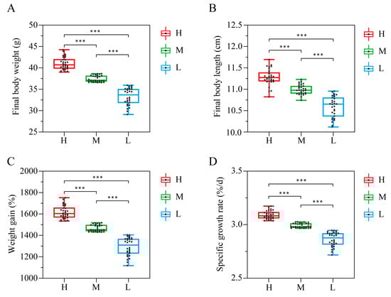 Box plots of growth performances in GFP families (n = 30). Note: (A) FBW, final body weight. (B) FBL, final body length. (C) WG, weight gain. (D) SGR, specific growth rate. *** indicates extremely significant differences (p < 0.001). H, high growth performance level; M, medium growth performance level; L, low growth performance level.