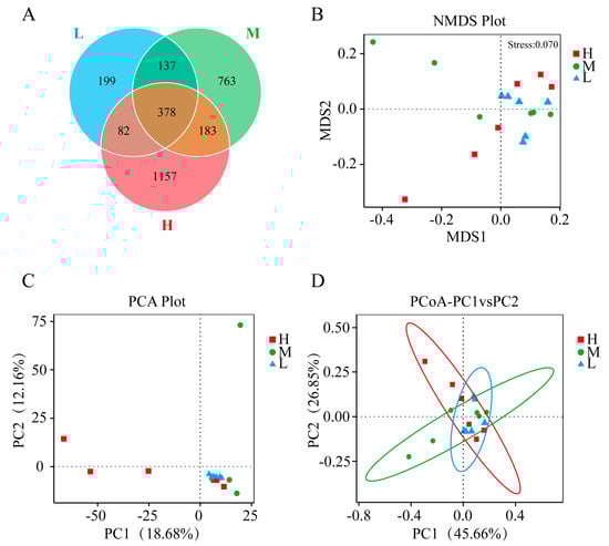 (A) Venn diagram of OTUs in GFP families with three growth performances; (B) based on Bray–Curtis distances, nonmetric multidimensional scaling (NMDS) analysis in GFP families with three growth performances; (C) principal component analysis (PCA) in GFP families with three growth performances; (D) principal coordinates analysis (PCoA) in GFP families with three growth performances. H, high growth performance level; M, medium growth performance level; L, low growth performance level.