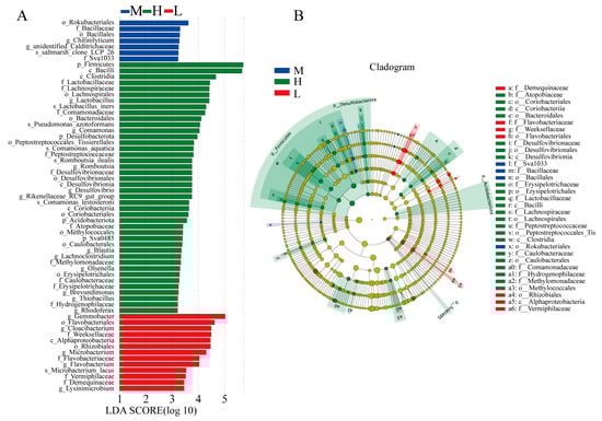 (A) A histogram of the distribution of linear discriminant analysis (LDA) values among GFP families with three growth performance groups; (B) an evolutionary branching diagram of species abundance among GFP families with three growth performance groups. LDA score > 2.2. In a branching diagram, node size represents the average relative abundance of the taxon. The yellow nodes represent taxa that are not significantly different among the three groups, whereas the green, red, and blue nodes indicate that these taxa are significantly different. And this color represents a higher abundance in the corresponding sample group. Identifies taxa with significant differences using letters. H, high growth performance level; M, medium growth performance level; L, low growth performance level.