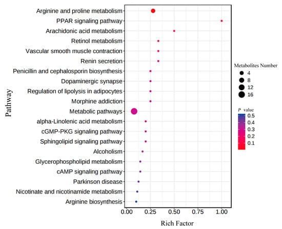 The KEGG enrichment analysis revealed that ”D-arginine and D-ornithine metabolism”, “arginine biosynthesis”, “arginine and proline metabolism”, “tryptophan metabolism”, “amino acid biosynthesis”, ”ABC transport synthesis”, “TCA cycle”, “taurine and hypotaurine metabolism”, “alanine, aspartate, and glutamic acid metabolism”, “phenylalanine, tyrosine, and tryptophan biosynthesis”, “linoleic acid and purine metabolic pathways”, “pantothenic acid and CoA biosynthesis”, and “thiamine metabolism pathway” were significantly enriched (Figure S5). Likewise, we performed the enrichment analysis with 20 key metabolites, and they were enriched in the pathways, including “arginine and proline metabolism”, “PPAR signaling pathway”, “arachidonic acid metabolism”, and “retinol metabolism” (Figure 6). Compared to individuals from M and L groups, the upregulated metabolites in Group H were involved in “arginine and proline metabolism”, “arachidonic acid metabolism”, “alpha-Linolenic acid metabolism”, and “purine metabolism” etc. Likewise, the upregulated metabolites in Group L were enriched in “arginine biosynthesis” and “nicotinate and nicotinamide metabolism”. Interestingly, we found that the pathways associated with metabolism of amino acids and fatty acids were extensively detected based on the enrichment analyses. Hence, we inferred that the upregulated metabolites related to metabolism of amino acids and fatty acids may play critical roles in the growth of GFP.
