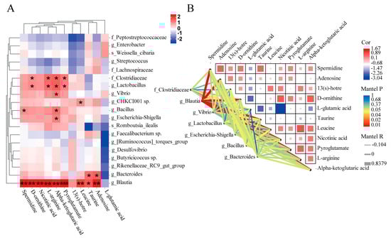 To find the key microbiota and metabolites associated with growth, the correlation analysis of these two datasets was performed. The results indicated that there was a close correlation between the gut microbiota and metabolites in H and L groups (Figure 7A). The results of the Mantel test analysis were consistent with the correlation results (Figure 7B). The abundances of Clostridiaceae and Lactobacillus were significantly positively correlated with the levels of pyroglutamate, alpha-ketoglutaric acid, L-arginine, and D-ornithine. The abundance of Bacteroides was positively correlated with the levels of adenosine and taurine. Notably, the abundance of Blautia was highly positive correlated with the levels of adenosine, taurine, leucine, pyroglutamate, alpha-ketoglutaric acid, L-arginine, nicotinic acid, D-ornithine, and spermidine. In addition, it was negatively correlated with the levels of L-glutamic acid. However, among the main metabolites, alpha-ketoglutaric acid was significantly correlated with several gut microbiota, including Clostridiaceae, Lactobacillus, Bacteroides, Blautia, Vibrio, CHKCI001 sp., Bacillus, and Escherichia-Shigella. Meanwhile, metabolite-to-metabolite correlation analysis revealed that the abundances of key differential metabolites, except L-glutamic acid, that were positively and significantly correlated.