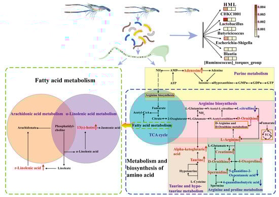 The metabolite pathway enrichment and integrative analysis showed that the gut metabolites and their association with gut microbiota affected the growth performance of GFP by mediating the pathways of metabolism of amino acids and fatty acids (Figure 8). In “Purine metabolism”, adenosine, a key regulatory in energy metabolism, was significantly upregulated in Group H. Likewise, lots of metabolites, such as L-arginine, spermidine, creatinine, D-oxoproline, and D-ornithine, which mediate the downstream pathways, including arginine biosynthesis and metabolism, as well as taurine and hypotaurine metabolism, were upregulated in Group H. Importantly, all of arginine, taurine, and hypotaurine are associated with the biosynthesis of growth hormone in animals. Moreover, the unsaturated fatty acids (i.e., α-Linolenic acid and 13(s)-hotre) related to fatty acid metabolism were also upregulated in the fast-growing individuals. The up-regulated key metabolites that participate in arginine, taurine, and hypotaurine biosynthesis and metabolism, as well as metabolism of unsaturated fatty acids, play a vital role in the growth of GFP. They could be used as potential biomarkers for selecting the fast-growing prawns.
