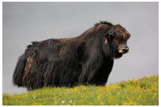 Yak (Bos grunniens) is the main livestock living in the Qinghai Tibet Plateau and its surrounding areas [1]. It is an advantageous animal species that can make full use of grassland resources and carry out animal production. Additionally, it is a unique genetic resource in plateau areas. It can provide meat, milk, wool and fuel for people in pastoral areas. It is closely related to the life of people in plateau areas [2,3,4,5]. Ashidan yak is a new breed of hornless yak bred by Chinese scientists using the population subculture breeding method. (Figure 1). Ashdan yak is based on the Qinghai Plateau polled yak as the parent, the application of testcross and controlled inbreeding, combined with the use of molecular maker-assisted breeding method to shorten the breeding cycle after four generations of breeding. It has the characteristics of good meat production performance, strong stress resistance, high reproductive performance, easy enclosure feeding and high economic benefits [6]. At present, studies on Ashidan yak include association analysis between copy number variants (CNV) and growth traits and genome-wide prediction [6,7,8,9].