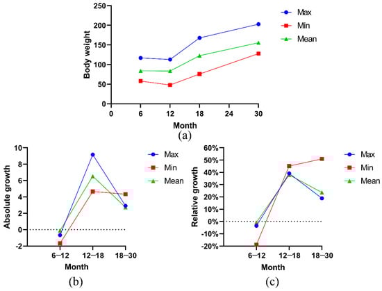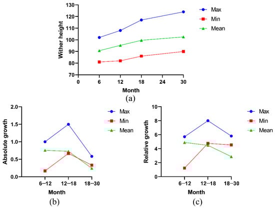 In the early growth and development process of Ashidan yak, the average body oblique length showed an increasing trend, while the maximum value showed a fluctuation trend (Figure 4a). Body oblique length refers to the straight line distance from the most front end of the humerus to the back end of the ischial tuberosity. The measurement tool for the body oblique length of the yak is a soft ruler, which is used close to the trunk of the yak. Additionally, the yak undergoes a long cold season, their trunk changes, some individuals become thinner, and the body oblique length may also become smaller. The maximum body oblique length of Ashidan yak decreased from 6 to 12 months of age, but the average and minimum of Ashidan yak increased from 12 to 18 months of age and from 18 to 30 months of age. Figure 4b,c show the curves of absolute and relative growth calculated and drawn based on the measured body oblique length data. From 6 to 12 months of age, the average growth rate and growth value of body oblique length of Ashidan yak were basically in a positive growth state. The growth rate of the body oblique length of Ashidan yak at 12 to 18 months of age increased, and the growth rate of body length at 18 to 30 months of age increased again, with the fastest growth rate.