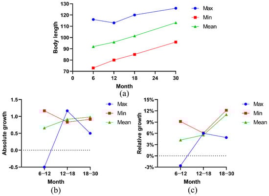 (a) Cumulative growth curve of body oblique length (BL); (b) absolute growth curve of BL; (c) relative growth curve of BL.