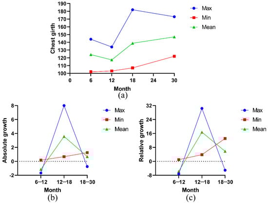 (a) Cumulative growth curve of chest girth (CG); (b) absolute growth curve of CG; (c) relative growth curve of CG.