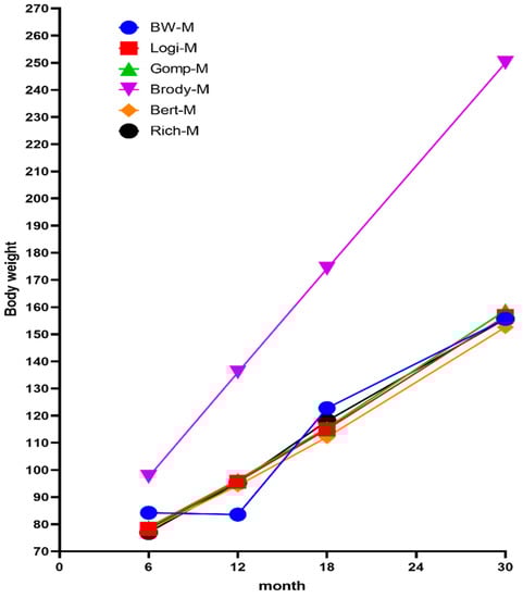 The fitting results of five nonlinear models to the body weight of Ashidan yak are shown in Figure 6. The theoretical values of the growth and development stages of Ashidan yak from 6 months to 30 months showed a steady upward trend in the five models. Among the five models, the fitted curve of body weight of Ashidan yak by the Brody model was significantly different from the measured growth curve, while the fitted curve of body weight by the Logistic model, Gompertz model, von Bertalanffy model and Richards model were close to the actual growth curve, and the three curves were consistent. In the figure, three kinds of curves overlap. The logistic model, Gompertz model, von Bertalanffy model and Richards model showed that the estimated weight at 12 months of age was higher than the measured value, the estimated weight at 6 months and 18 months of age was lower than the measured value, and the estimated weight at 30 months of age was close to the measured value.