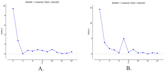 Delta K values for the STRUCTURE HARVESTER analysis for Ajoyani (A) and Quimsachata (B) populations.
