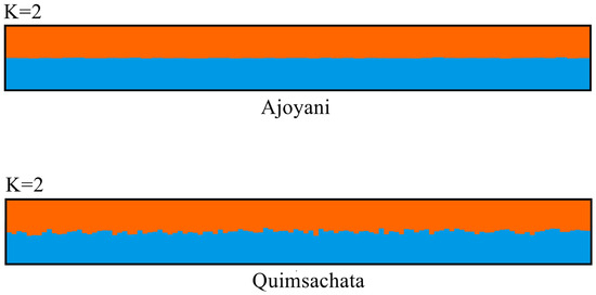 In addition, from the same data, the analysis of the population structure was carried out based on the admixture level of each alpaca individual using the STRUCTURE program [30]. K = 2 (Figure 2) is the most optimal value for both the Ajoyani and Quimsachata populations