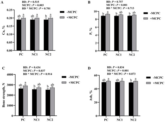The bone strength (p = 0.430 and p = 0.910, respectively) and Ca (p = 0.510 and p = 0.700, respectively), P (p = 0.760 and p = 0.710, respectively), and ash (p = 0.830 and p = 0.870, respectively) percentage in bone were not significantly (p > 0.10) affected by the basal diet or the interaction of diet × MCPC (Figure 1). MCPC showed a significant (p < 0.05) positive effect on bone strength, Ca, P, and ash percentage in bone by +8.3%, +4.6%, +3.6% and +3.0%, respectively, in comparison to diets without MCPC.