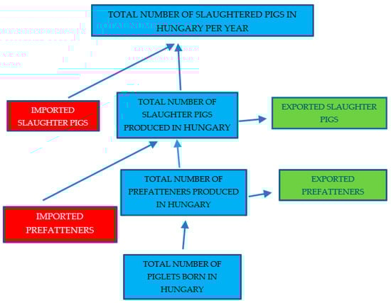 Figure 1 shows the way of calculation to have the total number of slaughter pigs being produced annually in Hungary as follows: the total number of slaughter pigs produced per sow per year = ((total number of igs slaughtered per year—total slaughtered (culled) sows per year)—total number imported live pigs for immediate slaughter—total number of imported prefatteners + total number exported prefatteners + total number of exported live pigs for immediate slaughter)/total number of sows per year.