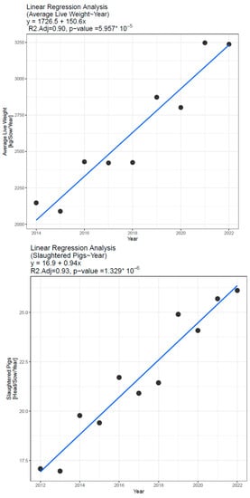 We observed a statistically significant association between the year and the average live weight of slaughtered pigs per sow and the number of slaughtered pigs per sow (p < 0.001, in both cases). The adjusted R-squared values were higher than 90% in both cases, indicating a very strong association between the variables. Based on the linear regression model, the live weight of slaughtered pigs increased by 150.6 kg/sow/year, and the number of slaughtered pigs increased by 0.94 pigs/sow/year (Figure 2).
