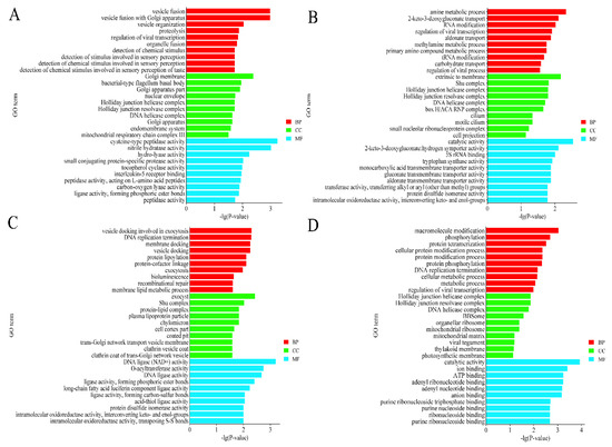 Figure 3. Top 10 enriched GO terms of host genes of DECs in 4 groups. The top 10 enriched GO terms of host genes of DECs in (A) MM-FT vs. MM-LT (B) MM-FT vs. ww-FT, (C) MM-LT vs. ww-LT, (D) ww-FT vs. ww-LT. The horizontal and vertical coordinates represent the GO terms and -lg(p-value) of the enriched genes, respectively.