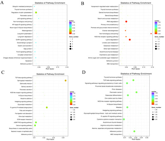 Figure 4. Twenty enriched KEGGs of host genes of DECs target genes in 4 groups. Twenty enriched KEGG of host genes of DECs in (A) MM-FT vs. MM-LT, (B) MM-FT vs. ww-FT, (C) MM-LT vs. ww-LT, (D) ww-FT vs. ww-LT. horizontal and vertical coordinates represent the -lg(p-value) of enriched genes and KEGG pathway, respectively. The rich factor is the ratio of the number of differentially expressed genes to the number of annotated genes enriched in that pathway term. The size of the circles in the graph indicates the number of differential genes enriched in the pathway.