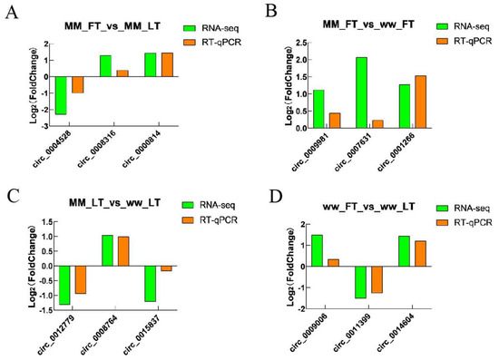 To verify the accuracy of the sequencing data, we randomly selected 12 circRNAs: circ_0004528, circ_0008316, circ_0000814, circ_0001266, circ_0008316, circ_0009981, circ_0007631, circ_0014604, circ_0012779, circ_0008764, circ_0015837, circ_0009509, circ_11399, and circ_0009006 were validated by RT-qPCR assay, and GRPDH was the internal reference gene. The results showed that the RT-qPCR trends and RNA-seq expression trends were consistent, indicating that the sequencing results were reliable (Figure 6; Supplementary Table S7).