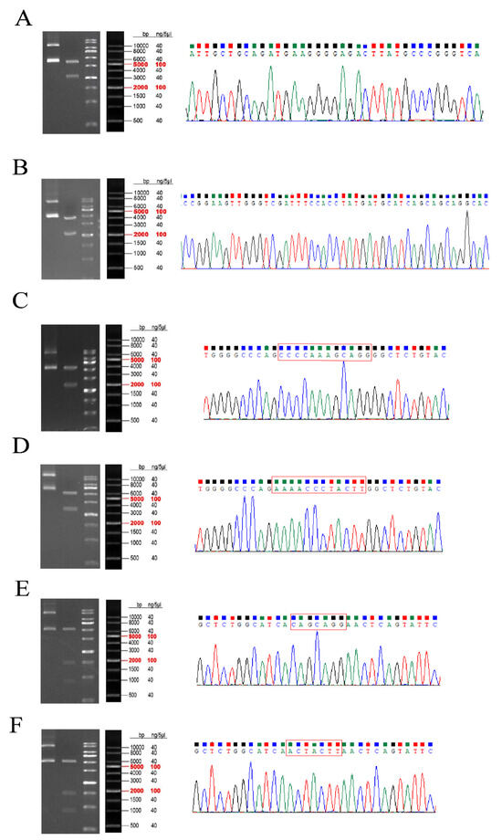 The sequencing results of the circ_0003259 overexpression vector (Figure 7A) and circ_0012128 overexpression vector (Figure 7B) are shown in the figure, and the mutant plasmid sequences were the mutation of CAGCAGG to ACTACTT in TXLNA-3′UTR (Figure 7C,D) and the mutation of CCCCAAAGCAGG to AAAACCCTACTT in FGFR1-3′UTR (Figure 7E,F), which were consistent with the expected results and could be tested in the follow-up (Supplementary Table S8).