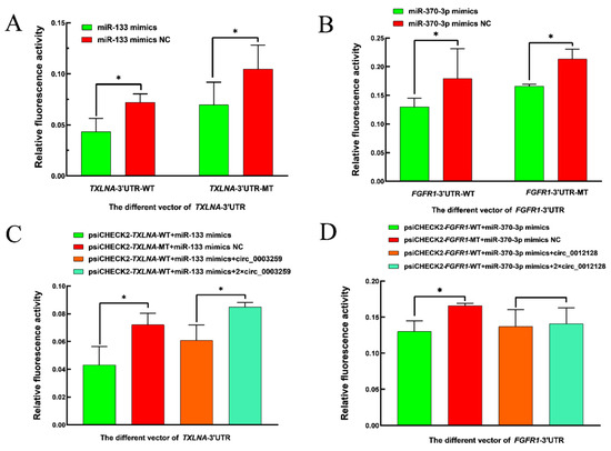 Figure 8. Double luciferase activity detection results. (A) Relative fluorescence activity was detected after cotransfection of oar-miR-133, oar-miR-133 mimics NC, TXLNA-WT, and TXLNA-MT into 293T cells. (B) Relative fluorescence activity was detected after cotransfection of oar-miR-370-3p mimics, oar-miR-370-3p mimics NC, FGFR1-WT, and FGFR1-MT into 293T cells. (C) Relative fluorescence activity was detected after cotransfection of circ_0003259, oar-miR-133 mimics, and TXLNA into 293T cells. (D) Relative fluorescence activity was detected after cotransfection of circ_0012128, oar-miR-370-3p mimics, and FGFR1 into 293T cells. Note: “*” indicates significant differences (p > 0.05).