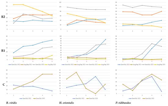 The area around the city of Plovdiv in Central Bulgaria is an important agricultural region where most of the country’s rice production is concentrated. It falls within the continental climatic zone and the weather is temperate, with no dry season but hot summers (type CFa, following the Köppen–Gieger classification) [17]. We chose two rice fields of a similar size approximately 20 km from each other on a straight line, situated to the north (Rice Field 1 (R1), near the village of Tsarimir, approximate area: 3 ha) and west of the city (Rice Field 2 (R2), near the village of Tsalapitsa, approximate area: 3.5 ha). As a control site (C), we chose a stagnant pond with a natural water cycle (approximate area: 3 ha) near a large lake designated as a protected area for bird species to the north of Tsarimir and in the same area as R1. Standard rice cultivation practices in Bulgaria involve flooding of the fields in May and, after germination, which occurs in 2–3 weeks, draining and pesticide application; in late May or early June, the fields are flooded again and remain so until mid-September, when the crops are collected. For this reason, the duration of the study was set for the period June–September in both 2022 and 2023.